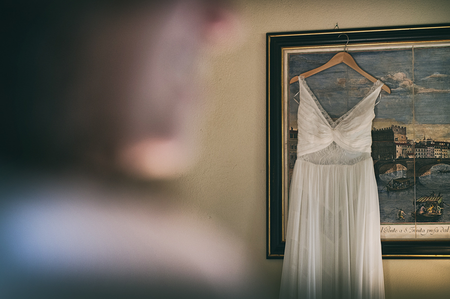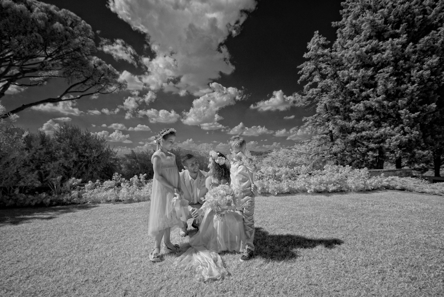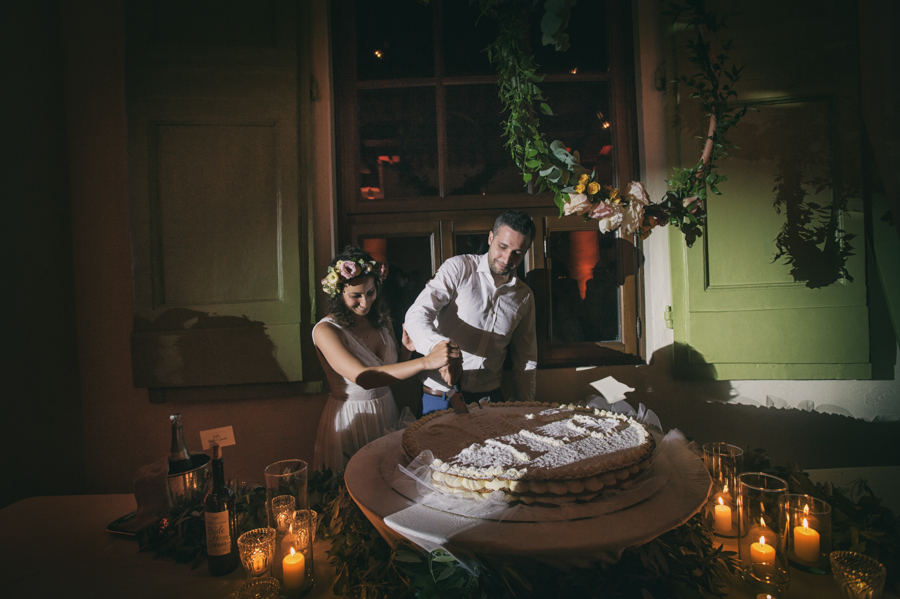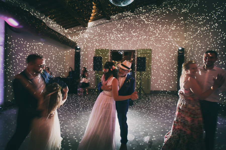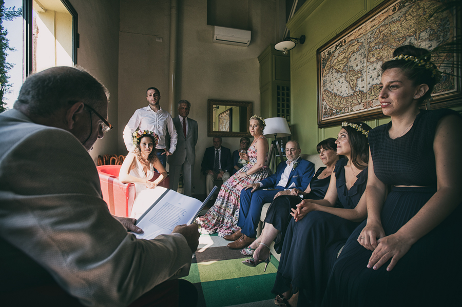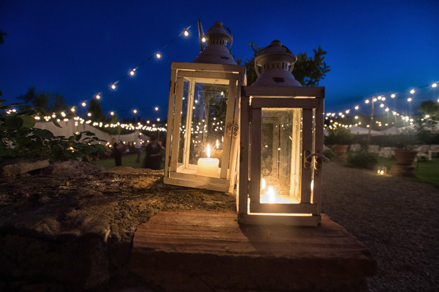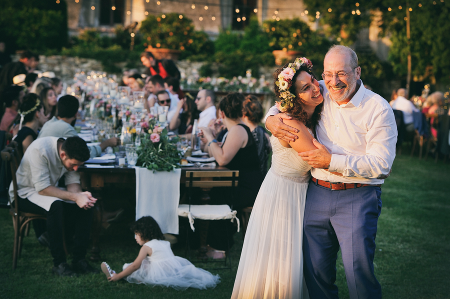 Relaxed atmosphere at the beginning and full of energy at the end. Many friends from different countries had fun celebrating the wedding of this nice couple. The entire wedding – the preparation of the bride and groom (included the first look), the wedding ceremony and the party – took place in the Villa Medicea di Lilliano, a splendid location immersed in the Tuscan countryside not so far from the center of Florence. For the jewish wedding ceremony they chose the beautiful terrace of Villa Medicea di Lilliano that offer an amazing view on Tuscan countryside. The Chuppah is located at the end of the terrace. From where you can see the Duomo of Florence. The jewish wedding ceremony finishes with the smashing of the glass. The green and the beautiful cloudy sky favor the use of infrared shots (to know more about infrared photography click here). All the photographic service has been a mix of candid, photo journalistic and spontaneous shots with few posed pictures. The sunset light and the blu hour have been the right moments for the photographic service with particolar and nice photos.