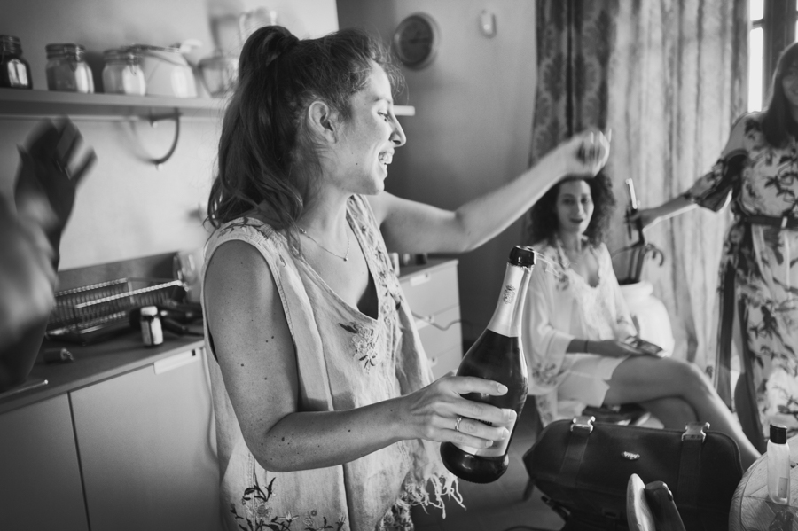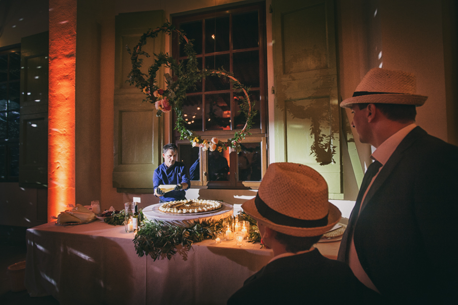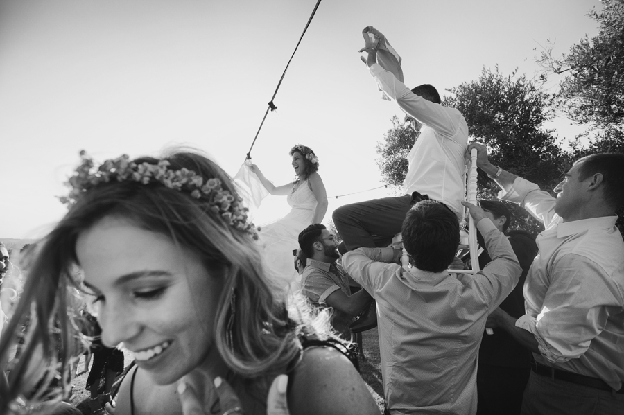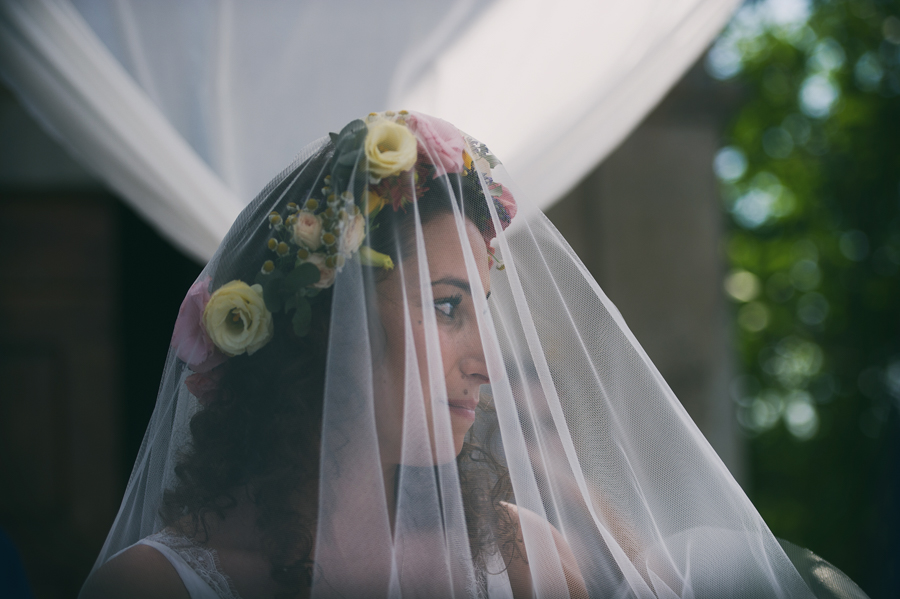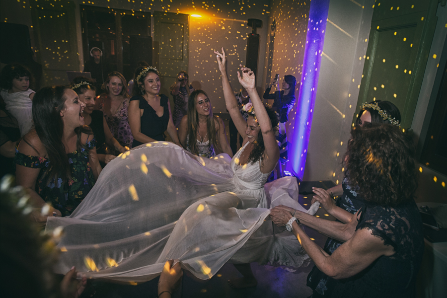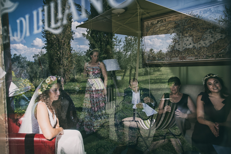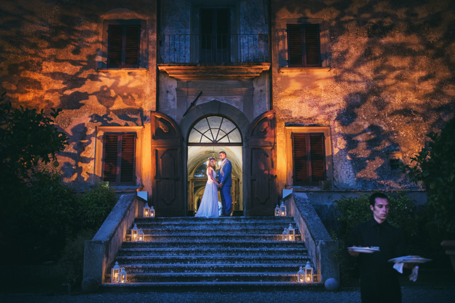 Relaxed atmosphere at the beginning and full of energy at the end. Many friends from different countries had fun celebrating the wedding of this nice couple. The entire wedding – the preparation of the bride and groom (included the first look), the wedding ceremony and the party – took place in the Villa Medicea di Lilliano, a splendid location immersed in the Tuscan countryside not so far from the center of Florence. For the jewish wedding ceremony they chose the beautiful terrace of Villa Medicea di Lilliano that offer an amazing view on Tuscan countryside. The Chuppah is located at the end of the terrace. From where you can see the Duomo of Florence. The jewish wedding ceremony finishes with the smashing of the glass. The green and the beautiful cloudy sky favor the use of infrared shots (to know more about infrared photography click here). All the photographic service has been a mix of candid, photo journalistic and spontaneous shots with few posed pictures. The sunset light and the blu hour have been the right moments for the photographic service with particolar and nice photos.