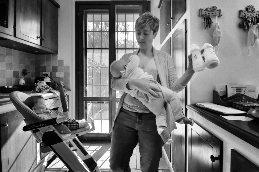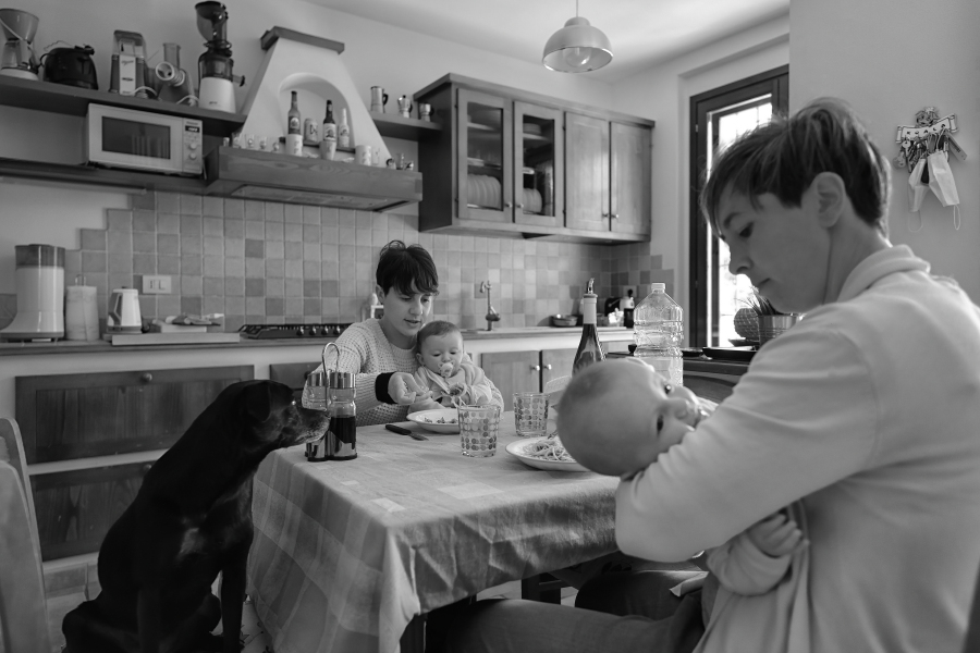 Il mio approccio alla fotografia, sia nel New Born che nella Maternity, è sempre lo stesso che da anni caratterizza i miei lavori fotografici sul matrimonio: raccontare una storia con un approccio reportagistico e documentario. Immagini colte, attimi presi, situazioni reali che trasmettono emozioni e dovranno stimolare nel tempo – almeno nelle mie intenzioni – i ricordi di quei momenti vissuti. Ed è così che ho lavorato con i loro gemelli. Elena e Rachele mi hanno nuovamente aperto la loro casa; io mi sono fatto trasparente e ho lasciato che gli eventi accadessero fotografando una giornata tipo della coppia.