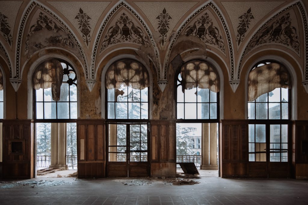 Entrando nel parco e salendo le scale davanti agli ingressi principali si può immaginare quanto fossero stati belli questi edifici. Architetture possenti con archi sorretti da immense colonne in marmo. Eleganti scalinate che convergono in ampie hall anch’esse colonnate. Camminando per i corridoi ormai distrutti dal tempo s’incontrano oggetti che sottendono storie: una valigia consunta, un’elegante scarpa da donna, un paio di occhiali rotti. Chissà che racconti dietro ad ognuna di queste cose. Come quella di Gucha, uno dei pochi occupanti rimasti nelle vecchie abitazioni che furono gli alloggi degli atleti del grande palazzetto dello sport: ‘ero un soldato e ho combattutto contro i russi durante la guerra, ma poi sono dovuto fuggire e rifugiarmi con mia moglie qui a Tskaltubo.‘ Mostra con orgoglio il suo tesserino di veterano di guerra, magra consolazione dopo aver lottato per difendere la propria terra. Sua moglie, Tarejan, non ha perso il sorriso e il senso dell’ospitalità.