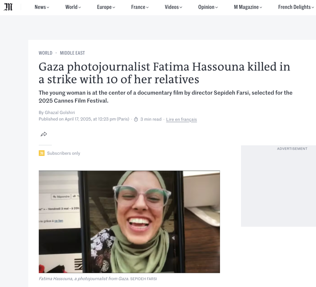 La foto che ha fatto il giro del mondo è stata generata da un’intelligenza artificiale. Nessuna fonte, nessun autore. Nessun volto vero. È un’illusione estetica, una figura femminile idealizzata, universalizzata, forse addolcita. Nel frattempo, la vera fotografia di Fatima, scattata sul campo, dove appare determinata, concentrata, con la fotocamera appoggiata sulla spalla, è stata ignorata dai più. Scartata. Invisibilizzata. Da una mia ricerca solo Il Manifesto – tra i giornali italiani – non ha utilizzato la sintografia, ma una fotografia della giornalista (magari anche altre testate lo hanno fatto e me ne scuso se non le ho trovate). Mentre all’estero testate importanti come il Time, la CNN, Euronews e Le Monde sono stati più attenti nella scelta dell’immagine riportando una foto ‘vera’ con i relativi crediti (The Guardian a parte con un doppio fake anche nei crediti).